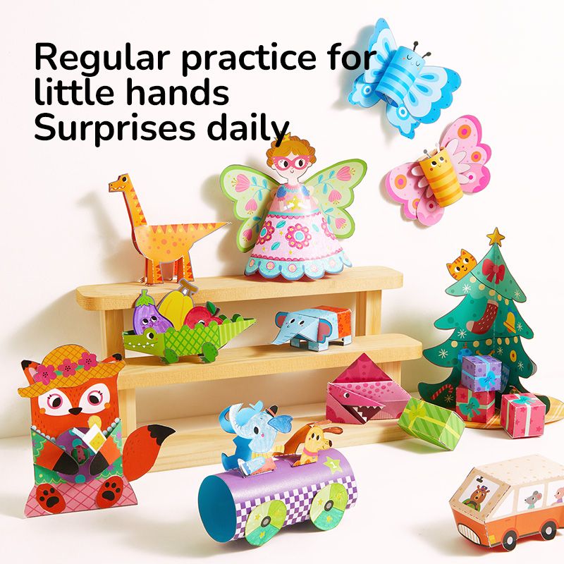 V balení je celkem 50 různých listů, ze kterých lze složit celkem 15 uměleckých objektů. Doporučujeme zapojit do tvoření i rodiče, aby dítě lépe pochopilo jednotlivé úkoly a mělo podporu při práci s nůžkami a lepidlem.