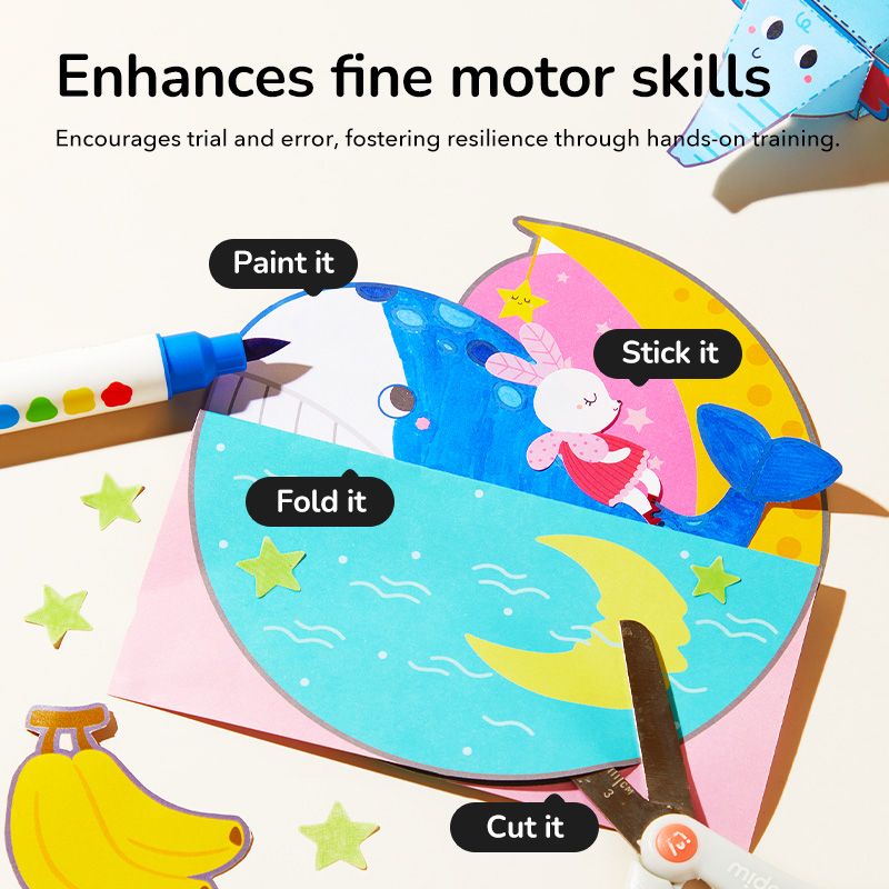 ✂️ Procvičuje stříhání, skládání a lepení – ideální příprava do školy