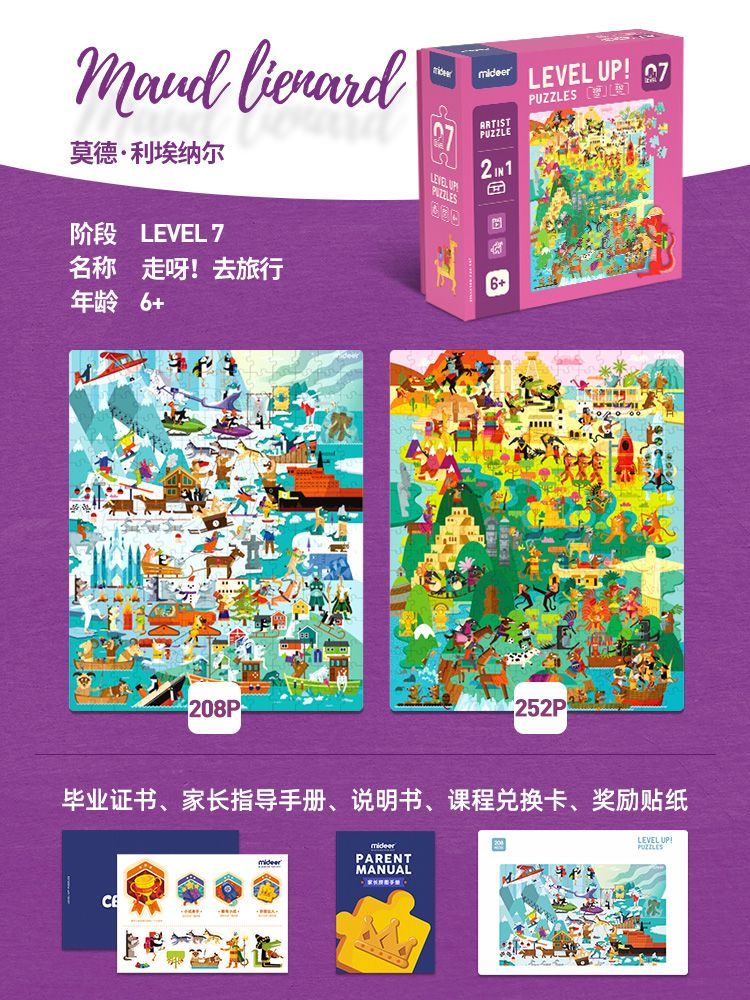 Pokročilý systém této skládačky se projevuje především ve třech aspektech. Počet dílků začíná od 2 dílků a postupně se zvyšuje až na 330 dílků. Dále se mění dle složitosti ilustrace z obrázku zvířete na přírodní, městské a jiné výjevy a v nejvyšší složitosti na geografii světa, čímž se přiměřeně rozšiřuje rozsah dětského poznávání. A konečně i výtvarné ztvárnění ilustrace má různě úrovně.