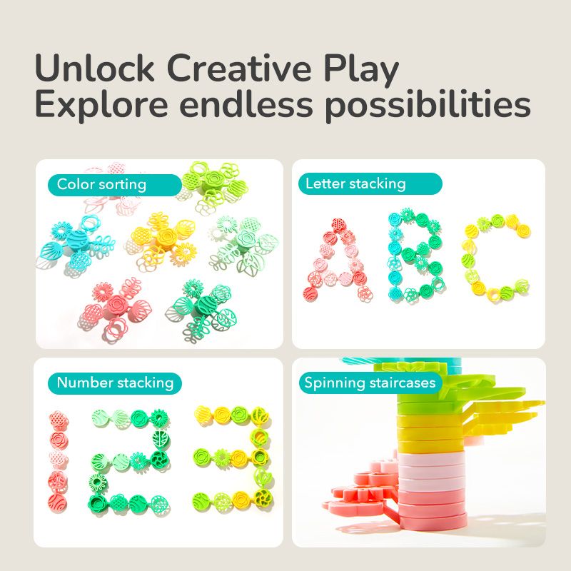 Sada obsahuje 70 dílků v různých tvarech a barvách, které děti mohou kombinovat do nekonečných variací – od spirál  přes barevné vzory až po písmena  nebo čísla . Nechybí ani závěsné ozdoby  pro ještě hravější tvoření. Praktický sáček  na uložení dílků navíc pomáhá udržet pořádek.