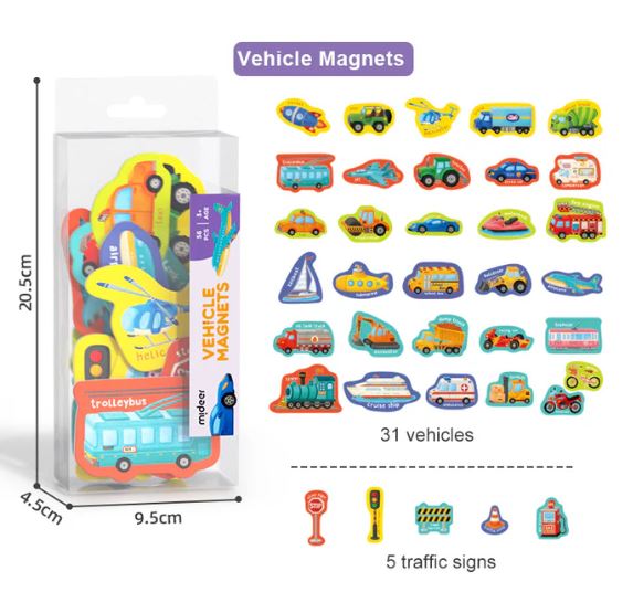 Dětské naučné magnetky s motivy dopravních prostředků.