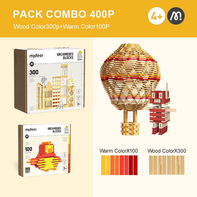 Sada obsahuje 400 pečlivě opracovaných dřevěných bloků v jednotném tvaru, což umožňuje stavět neomezené množství konstrukcí – od jednoduchých domečků přes lodě až po vysoké věže či celé městské scenérie.