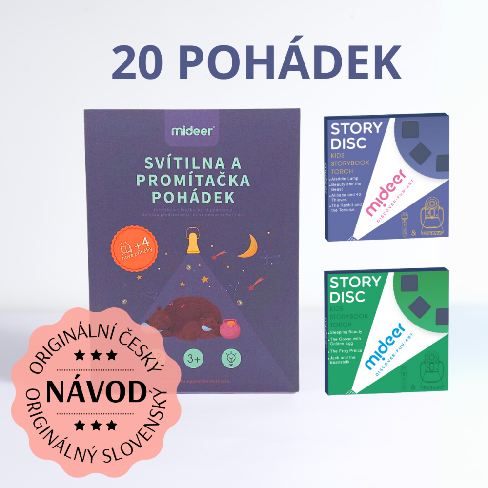 Součástí balení je brožurka s českými/slovenskými texty pohádek a obrázky pro vypravěče.
